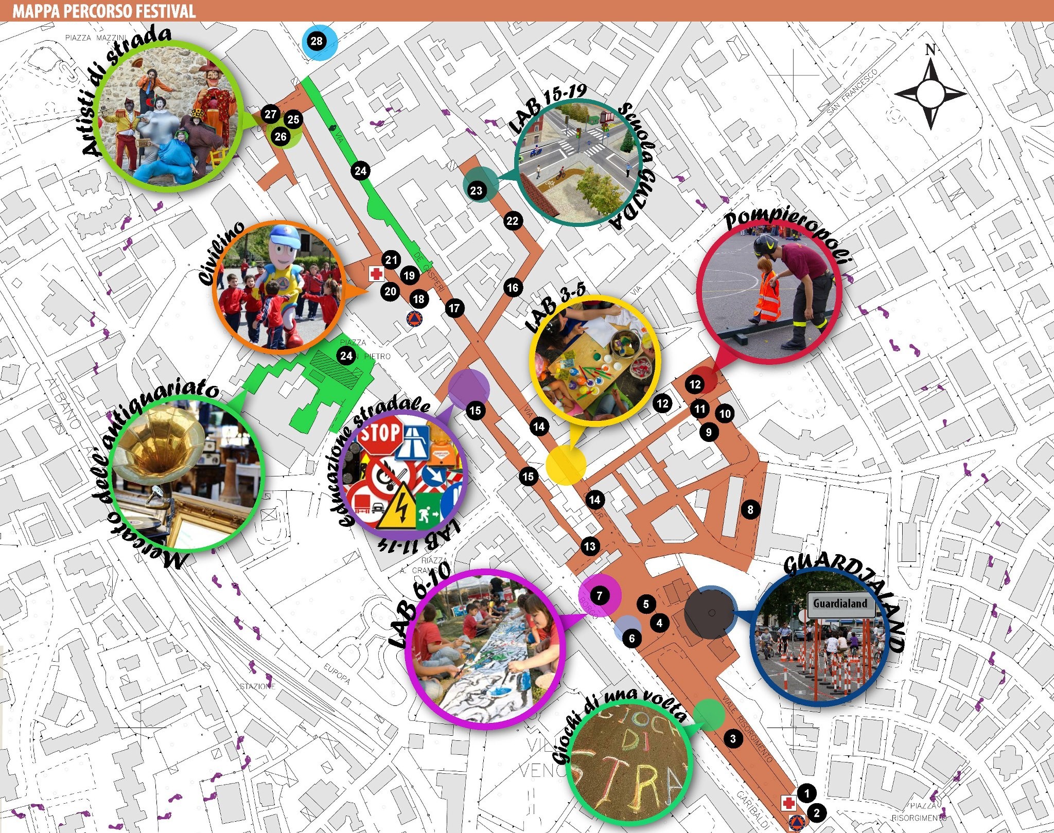 Dalle ore 9.00 fino alle ore 18.00, l’area che va da Viale Scalchi (Villa Ferrajoli)  a Piazza Pia si trasformerà in un piccolo parco giochi all’ aperto con tante attività suddivise in laboratori , dove i ragazzi saranno chiamati a mettere in atto tutte le loro doti.