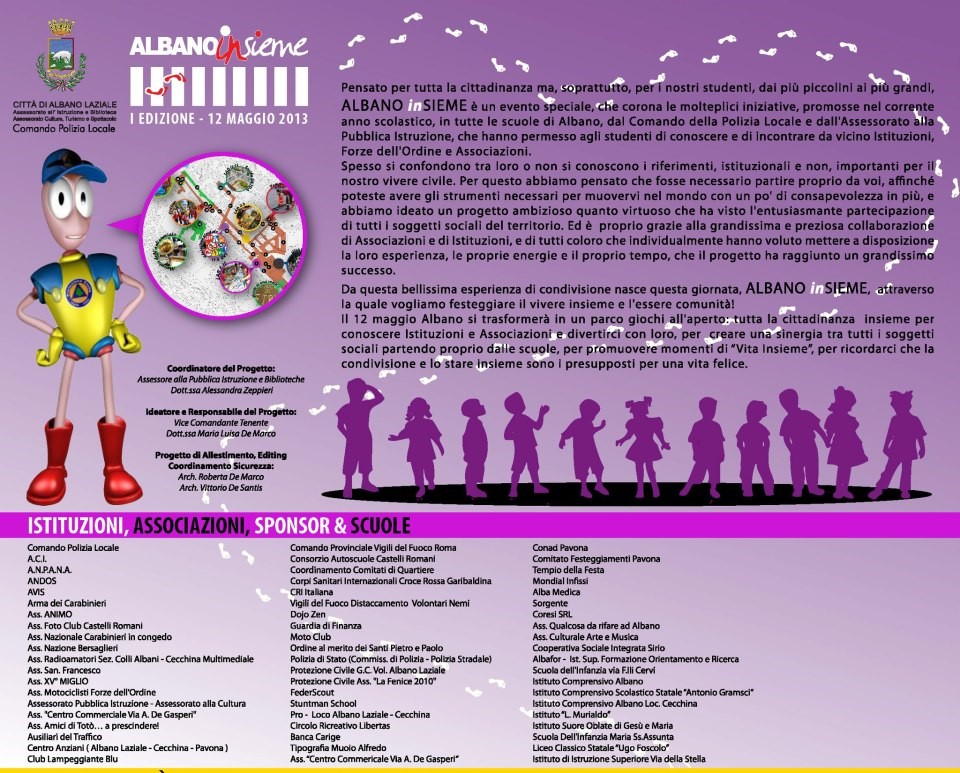 Pensato per tutta la cittadinanza ma, soprattutto, per i nostri studenti, ALBANO INSIEME è un evento speciale, che corona le molteplici iniziative, promosse nel corrente anno scolastico, in tutte le scuole di Albano che hanno permesso agli studenti di conoscere e di incontrare da vicino Istituzioni, Forze dell’Ordine e Associazioni.