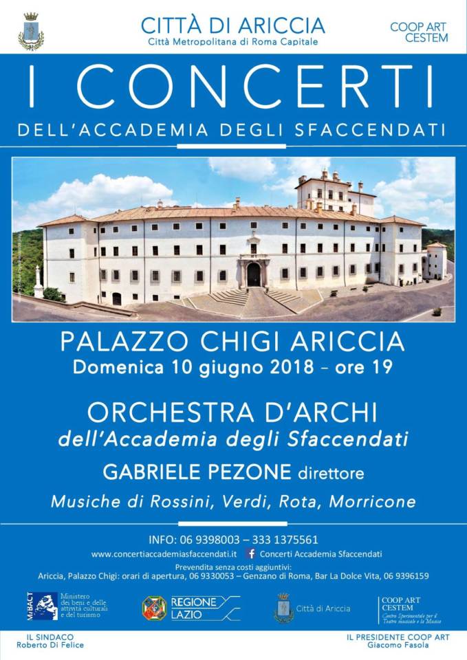 Domenica 10 giugno, alle ore 19, si terrà l’ultimo appuntamento del Ciclo di Primavera nella Sala Maestra del Palazzo Chigi di Ariccia. Per l’occasione è stata costituita appositamente, con la direzione del M° Pezone, l’ORCHESTRA D’ARCHI dell’Accademia degli Sfaccendati composta da giovani musicisti che avranno così l’opportunità di praticare quell’esperienza tra le più importanti e formative che è quella di suonare insieme in orchestra.