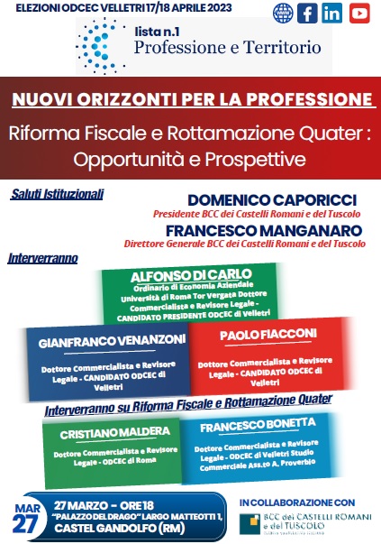 I candidati della lista “Professione e Territorio”, in vista delle elezioni del 17 e 18 aprile per la composizione del Consiglio dell’Ordine dei Commercialisti del circondario del Tribunale di Velletri, incontreranno professionisti, associazioni di categoria e operatori del settore lunedì 27 marzo alle ore 18 presso il Palazzo del Drago, sede della BCC dei Castelli Romani e del Tuscolo, in largo Matteotti, 1 a Castel Gandolfo. Si parlerà dei “Nuovi orizzonti per la professione”. L’incontro prevede i saluti istituzionali del presidente della BCC dei Castelli Romani e del Tuscolo, Domenico Caporicci, e del direttore generale dell’istituto di credito castellano, Domenico Manganaro, e a seguire gli interventi del professor Alfonso Di Carlo, candidato presidente, e dei candidati al consiglio e promotori dell’iniziativa dottor Gianfranco Venanzoni e dottor Paolo Fiacconi. Il dottor Cristiano Maldera, appartenente all’Ordine dei Commercialisti di Roma, e il dottor Francesco Bonetta, appartenente all’Ordine dei Commercialisti di Velletri, approfondiranno altresì le tematiche di strettissima attualità quali la riforma fiscale e la rottamazione quater.