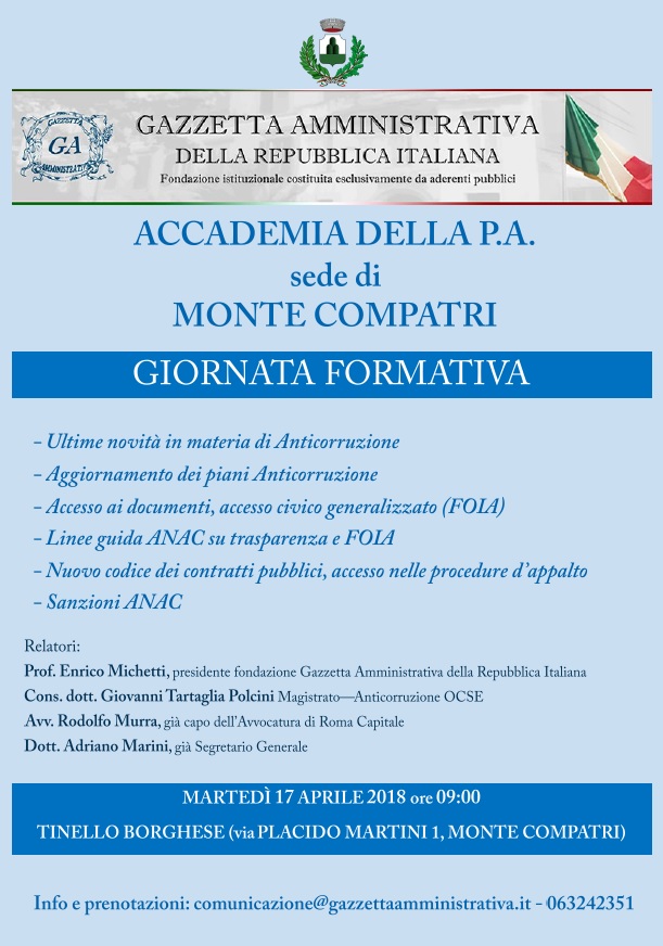 Nasce a Monte Compatri una nuova sede dell’Accademia della Pubblica amministrazione. Le ultime novità in materia di anticorruzione, l’accesso civico generalizzato, il nuovo codice e le procedure d’appalto, le sanzioni Anac: questi i temi che saranno affrontati martedì 17, dalle 09:00 alle 14:00, nel corso della prima giornata formativa che si svolgerà a Tinello Borghese (via Placido Martini, 1); in collaborazione con la fondazione Gazzetta Amministrativa della Repubblica Italiana (G.A.R.I).