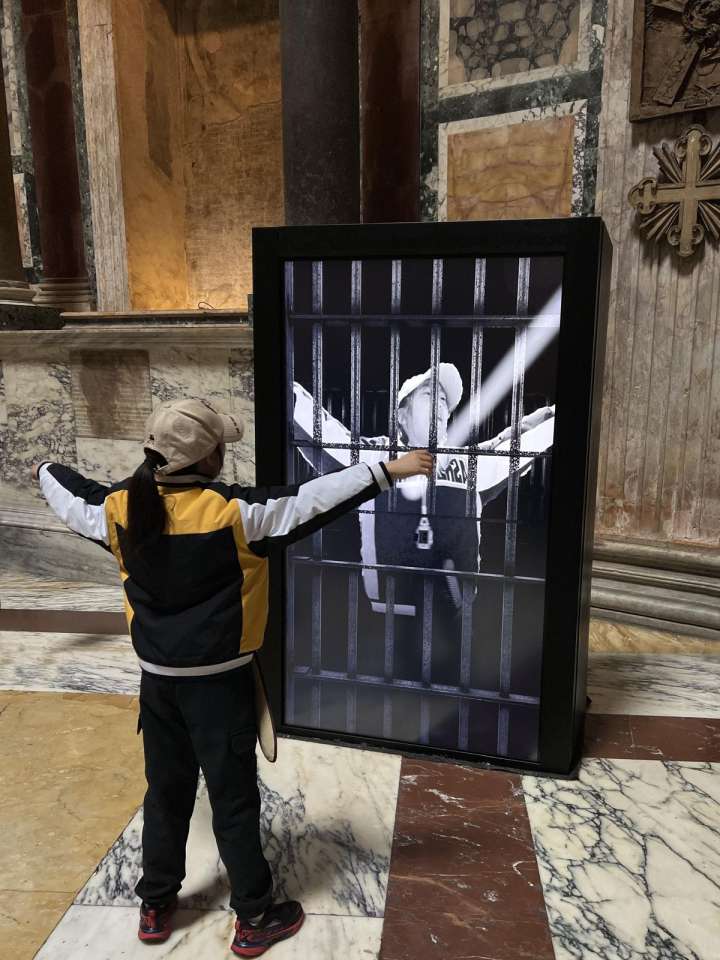 Il viaggio culmina nella quinta porta, quella del Carcere di Rebibbia, scelta da Papa Francesco come Porta Santa aggiuntiva del Giubileo. Qui il visitatore non è più solo spettatore, ma viene coinvolto in un’esperienza interattiva. Un sistema tecnologico di telecamere in real time proietta l’osservatore nel-la scena ponendolo di fronte a sé stesso e dietro delle sbarre. Quelle sbarre non rappresentano solo una reclusione fisica, ma sono anche gabbie interiori che limitano la nostra esistenza: paure, pregiu-dizi, ostacoli invisibili che ci rendono prigionieri.