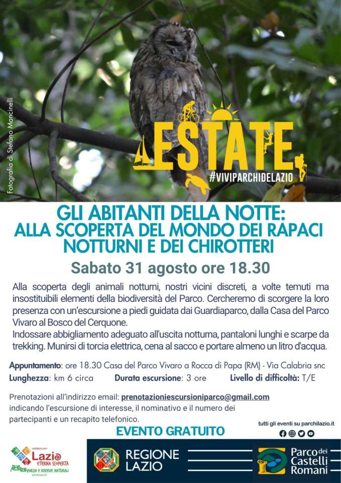 Sabato 31 agosto 2024 alle ore 18.30 si terrà l’escursione gratuita dedicata alla scoperta del mondo dei rapaci notturni e dei chirotteri dal titolo “Gli abitanti della notte”.