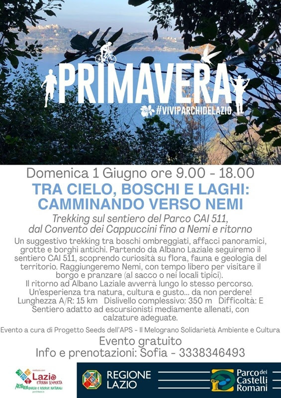 Domenica Primo giugno dalle ore 9.00 alle 18.00, l’appuntamento è con un trekking gratuito sul sentiero del Parco CAI 511, dal Convento dei Cappuccini fino a Nemi e ritorno. L’evento è a cura delle giovani guide di Progetto Seeds de “ Il Melograno, Solidarietà Ambiente Cultura – APS ”.