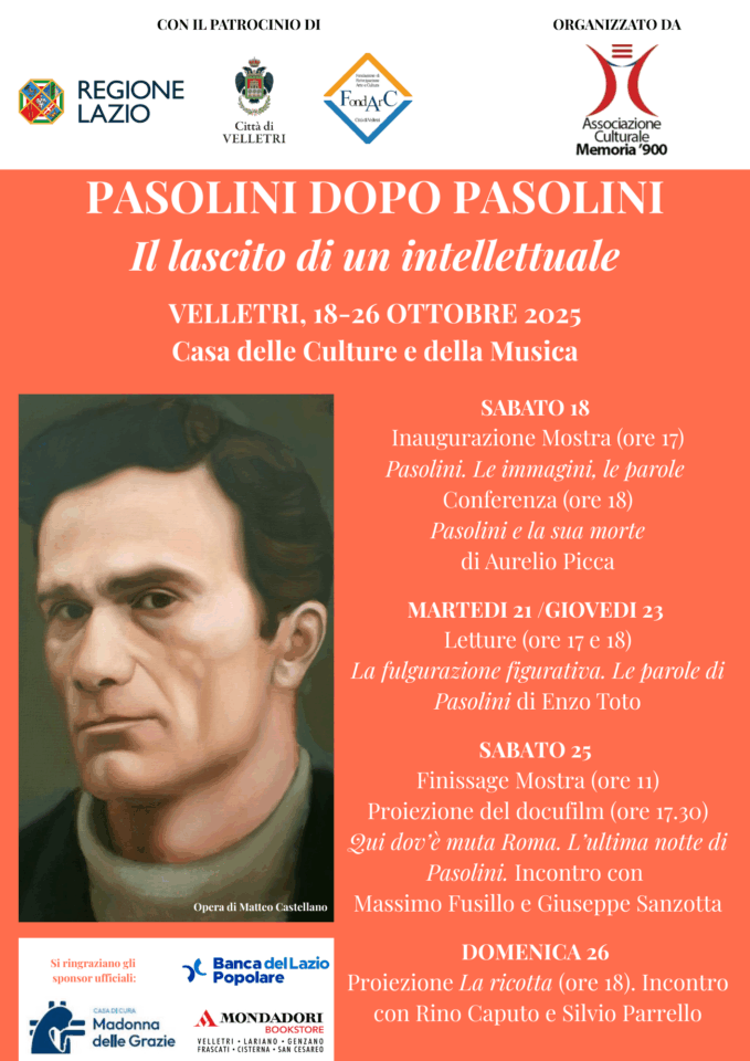Dal 18 al 26 ottobre 2025 la Casa delle Culture e della Musica di Velletri ospiterà la rassegna “Pasolini dopo Pasolini. Il lascito di un intellettuale”. La manifestazione è promossa dall’Associazione Culturale Memoria ’900 con il patrocinio di Regione Lazio, Città di Velletri e FondArc. Un evento culturale di grande valore che intende rendere omaggio a Pier Paolo Pasolini attraverso una mostra, letture, conferenze e proiezioni.