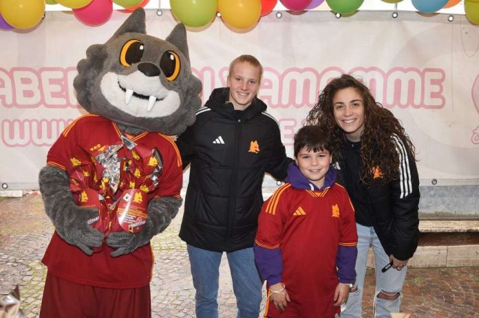 100 bimbi emozionati hanno ricevuto dalle mani dei dipendenti della grande famiglia dell’A.S. Roma e dalle calciatrici Benedetta Glionna e Zara Kramzar auguri, doni e uova di cioccolato durante un pomeriggio di festa organizzato da Salvamamme, insieme al Comitato Municipio 8,11 e 12 della Croce Rossa Italiana. Il Club Giallorosso ha consegnato durante la festa in tutto 200 uova che saranno donate nei prossimi giorni anche a tanti bambini malati, profughi e ad anziani soli. “Oggi 100 bimbi che hanno alle spalle situazioni complesse, anche di disagio socio-economico grave, hanno vissuto insieme un momento di serenità e di gioia, grazie alla generosità e la passione sociale dell’A.S. Roma”, dichiara Grazia Passeri, Presidente dell’Associazione “Salvabebè Salvamamme”