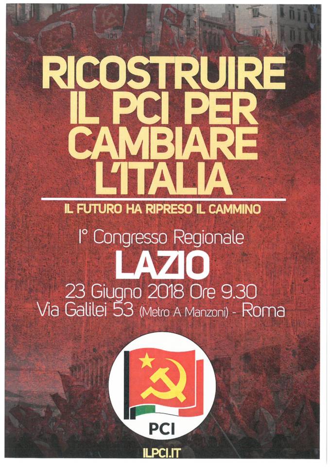 Con la relazione introduttiva del segretario Virgilio Seu, Sabato 23 giugno, alle ore 10.00 presso la sala di via Galilei, 53, in Roma, si aprirà il Primo Congresso regionale del Partito Comunista Italiano ricostituito due anni fa a Bologna.