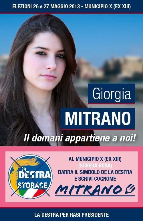 Iniziamo oggi un viaggio tra i giovani candidati nei Municipi romani dei vari schieramenti politici in competizione per le prossime elezioni amministrative capitoline di fine maggio. Il nostro primo incontro è con Giorgia Mitrano, candidata per La Destra di Francesco Storace nel X Municipio (ex XIII), un territorio storico, per radicamento per la destra romana.