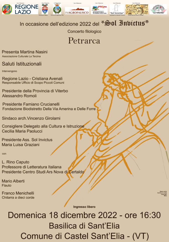 Domenica 18 dicembre sin dalle prime ore del mattino con il sorgere del sole, la Basilica si Sant’Elia accoglierà tutti coloro che vorranno godere dei giochi di luce al suo interno. I segreti del tempio d’inverno saranno svelati dallo studioso Stefano Cavalieri. Durante la mattinata saranno illustrati anche gli affreschi dalla voce del Sindaco arch. Vincenzo Girolami e dalla Consigliere Delegato prof.ssa Cecilia M. Paolucci, a seguire la presentazione del libro della Dottoressa Francesca Ceci “Didone senza Enea” alle ore 10:00, ma sarà la Terzina a chiuderà l’edizione 2022 del SOL INVICTUS con il concerto filologico “Petrarca” alle ore 16:30 con la partecipazione del Corteo storico che farà da cornice all’unicità dell’evento.