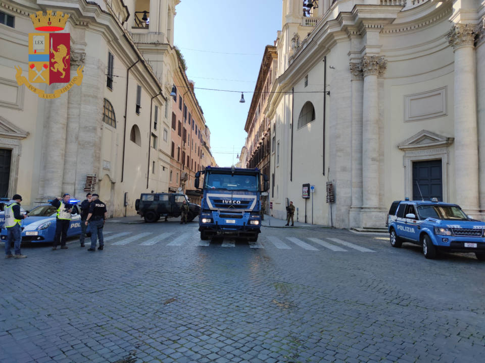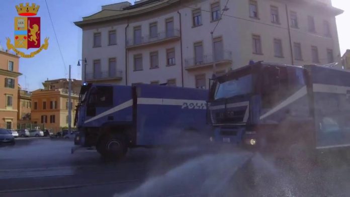 Roma. La Polizia di Stato partecipa all’attività di sanificazione delle strade della città con gli idranti del Reparto Mobile.
