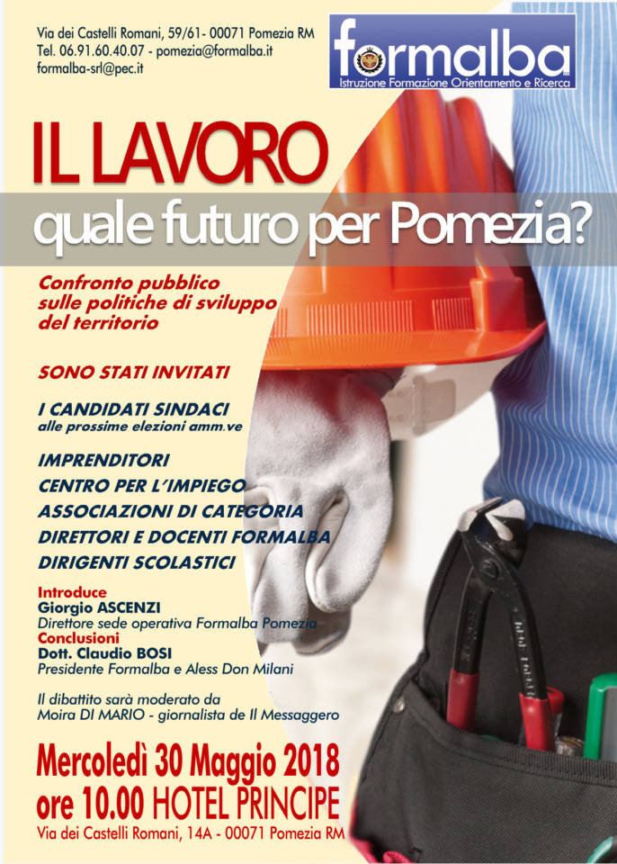 Formalba è da sempre presente sul territorio di Pomezia; operare nella formazione professionale e seguire i nostri allievi in un percorso che li conduce nel mondo del lavoro ci ha posto nella condizione privilegiata di interloquire con i diversi attori del territorio: imprese, scuole, istituzioni e associazioni.  Appare sempre più evidente come il mercato del lavoro stia profondamente cambiando. Da tempo è impossibile affrontare il tema del lavoro senza analizzarlo dal punto di vista della sua trasformazione che comprende diversi elementi: tecnologie, i nuovi mercati, la demografia, il diritto del lavoro e soprattutto la crisi economica. Riteniamo che il territorio di Pomezia esprima al contempo forti criticità ed evidenti potenzialità in merito  e che un’analisi condivisa sia una condizione doverosa per l’attivazione di processi virtuosi per la risoluzione di questa apparente contraddizione.