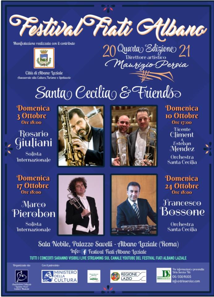 La splendida location di Palazzo Savelli è pronta ad accogliere la quarta edizione del Festival Fiati Albano Laziale. Sarà una kermesse dall’ampio respiro internazionale con solisti dell’Orchestra dell’Accademia Nazionale di Santa Cecilia e solisti di fama internazionale. I concerti si terranno ogni domenica, dal 3 al 24 ottobre 2021 alle ore 18, e saranno trasmessi in diretta streaming sul canale Youtube del Festival Fiati Albano Laziale. Tutte le informazioni sono reperibili sulla pagina Facebook del Festival. La manifestazione è curata dall’Assessorato alla Cultura del Comune di Albano Laziale, sotto l’organizzazione dell’Associazione “Luciano Pezzi” e la direzione artistica del Maestro Maurizio Persia.