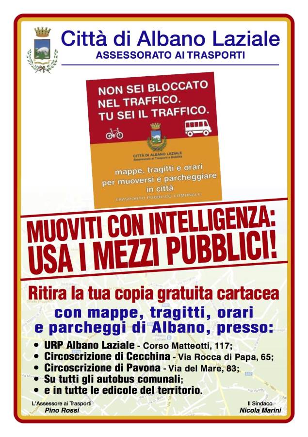 Su tutti gli autobus comunali, nelle edicole del territorio, nelle sedi dell’urp (ufficio relazioni con il pubblico) di Albano Pavona e Cecchina e nei centri sociali anziani verranno distribuite in questi giorni e saranno a disposizione gratuitamente le nuove guide tascabili che riprodurranno tutte le linee del trasporto pubblico locale con orari e percorsi e con l’ubicazione precisa dei parcheggi cittadini.