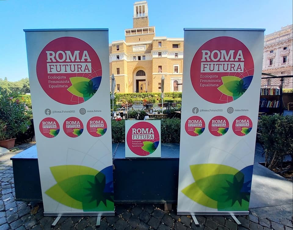 Una lista civica ecologista, femminista ed egualitaria, le tre parole programmatiche che campeggiano nel simbolo di ‘Roma Futura’, accanto alla stella del Campidoglio, che si tinge di verde e blu a richiamare il connubio tra tutela dell’ambiente e innovazione. Lo sfondo del simbolo, invece, è rosso magenta, una sintesi di colore che richiama la sinistra e le lotte femministe.