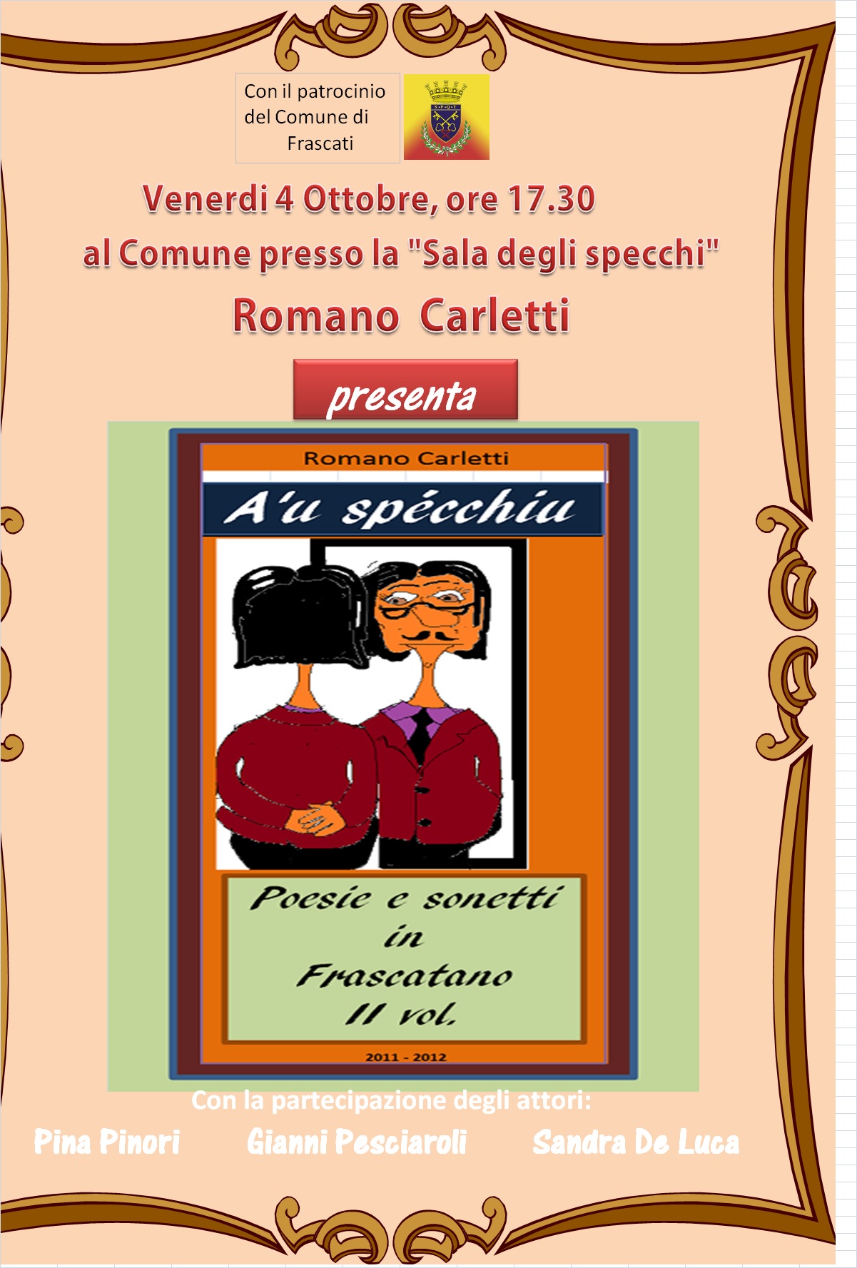A’u specchiu. Poesie e sonetti in Frascatano – Vol. II, il nuovo libro di Romano Carletti, sarà presentato venerdì 4 ottobre 2013 nella Sala degli Specchi del Comune di Frascati alle ore 17. «A’u specchiu» raccoglie la produzione in versi del biennio 2011-2012. Il dato saliente è la facilità di scrittura di Romano Carletti, che in questo biennio ha prodotto numerose liriche. E quelle raccolte in questo libro non sono tutte ma una selezione delle migliori, per cui il volume avrebbe potuto essere anche più folto di quanto non sia. In occasione della presentazione saranno anche presentate alcune recenti opere pittoriche di Carletti. Inoltre, gli attori Sandra De Luca, Pina Pinori e Gianni Pesciaroli metteranno in scena alcuni sonetti e canzoni del poliedrico autore frascatano e daranno vita ad alcuni interventi musicali.