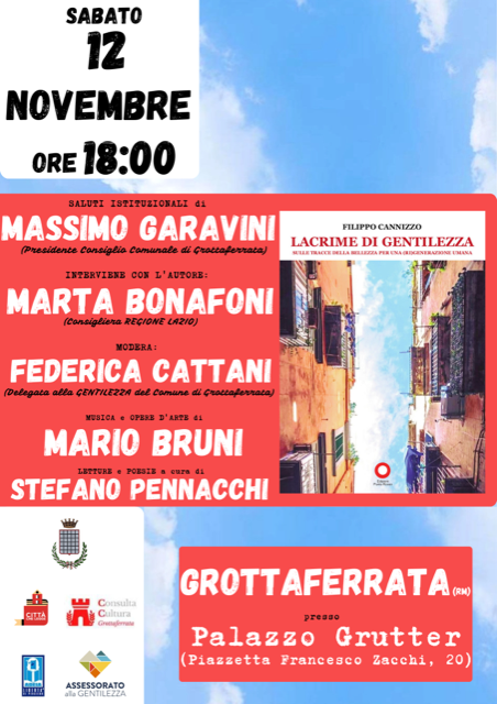 Sabato 12 Novembre 2022, ore 18:00, a Grottaferrata (Rm) nella splendida cornice di presso Palazzo Grutter (Piazzetta Francesco Zacchi, 20), si terrà la presentazione del libro del filosofo Filippo Cannizzo:”Lacrime di Gentilezza. Sulle tracce della bellezza per una (ri) generazione umana”. L’iniziativa è inserita nella rassegna letteraria “libri, arte, cultura” curata da Veronica Pavani.