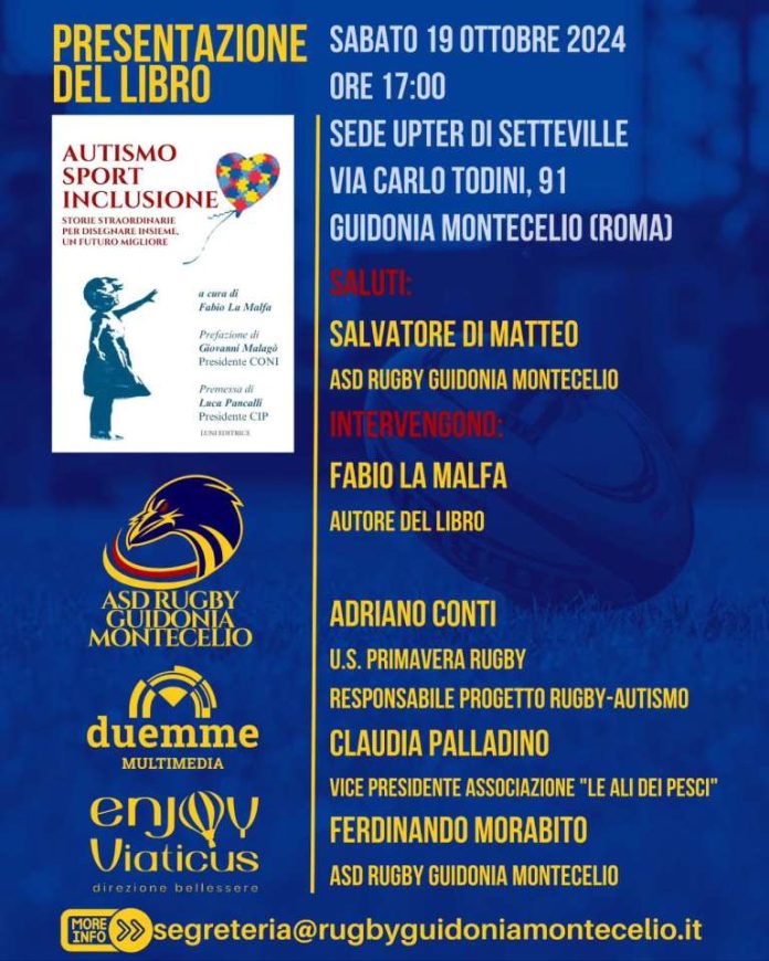 Sabato 19 ottobre 2024, alle ore 17:00 presso la sede UPTER di Setteville (Via Carlo Todini, 91), frazione di Guidonia Montecelio si svolgerà la presentazione del libro “Autismo Sport Inclusione”, con la presenza dell’autore Fabio La Malfa, maestro di Judo.