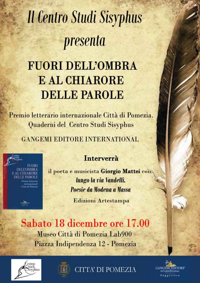 Sabato 18 dicembre alle ore 17.00 presso il Museo Città di Pomezia Laboratorio del Novecento. Interverranno la vice Sindaco Simona Morcellini, la direttrice del Centro Studi Sisyphus Fiorenza Castaldi, lo storico e critico letterario Massimiliano Pecora e il poeta e musicista Giorgio Mattei.