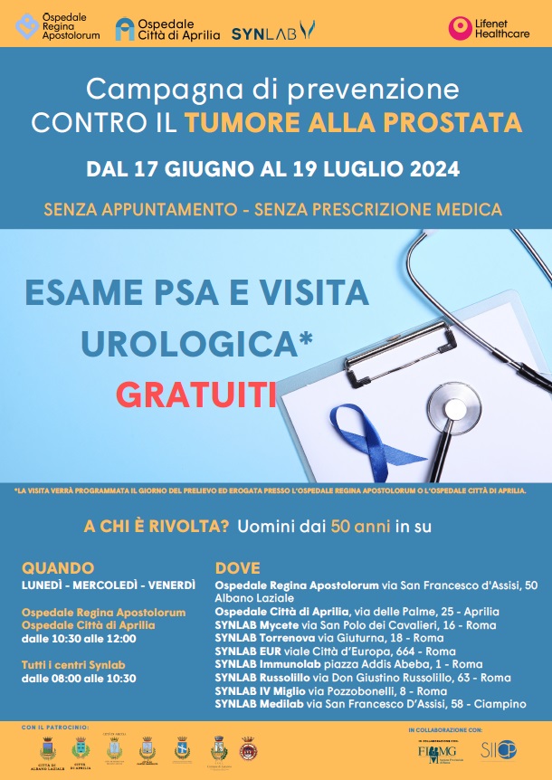 L’Ospedale Regina Apostolorum (ORA) e l’Ospedale Città di Aprilia (ODA), in collaborazione con il Gruppo Synlab, la FIMMG Lazio, FIMMG Roma e la SIICP, lanciano la campagna di prevenzione del tumore alla prostata che si terrà da lunedì 17 giugno fino a venerdì 19 luglio. L’iniziativa, che ha come obiettivo la diagnosi precoce del tumore della prostata, offrirà esame del PSA e visite urologiche gratuite a uomini dai 50 anni in su. Le visite specialistiche si terranno presso le strutture del Gruppo Lifenet di Albano Laziale e di Aprilia. Coinvolte le 7 sedi Synlab da Roma a Ciampino. L’iniziativa ha il patrocinio dei Comuni di Albano Laziale, Aprilia, Ariccia, Castel Gandolfo, Genzano di Roma, Lanuvio, Nemi.