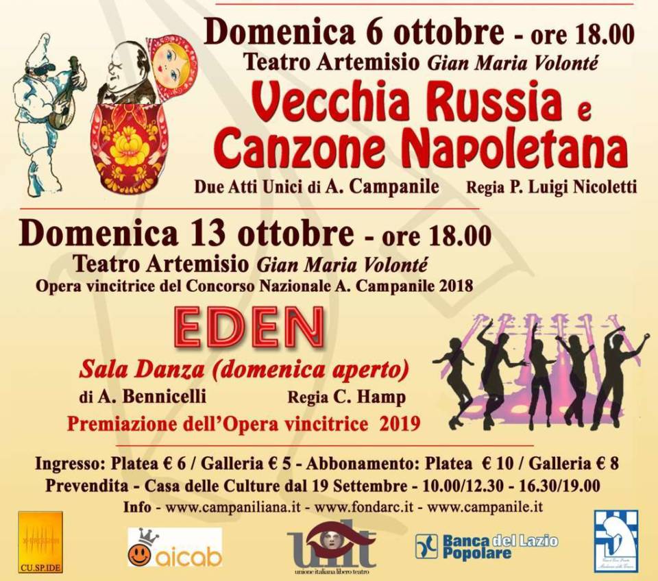 Ci sarà tanto teatro nell’edizione 2019 della “Campaniliana”, rassegna organizzata dalla Fondazione di Partecipazione Arte & Cultura Città di Velletri in collaborazione con l’Associazione Memoria ‘900. Domenica 6 ottobre andrà in scena, a cura della compagnia teatrale di Pierluigi Nicoletti, un duo di atti unici di Achille Campanile: “Vecchia Russia” e “Canzone napoletana”. Domenica 13 ottobre, invece, dopo l’attesa premiazione (la Giuria ha ultimato i lavori), la compagnia XPression per la regia di Christine Hamp metterà in scena “Eden. Sala danza (domenica aperto)”, opera vincitrice del 2018. Per l’occasione sono stati messi a disposizione dei prezzi vantaggiosi per assistere agli spettacoli: € 6,00 per la platea ed € 5,00 per la galleria (€ 10,00 platea ed € 8,00 galleria se si acquistano i tagliandi per entrambi gli spettacoli). A curare la prevendita l’Associazione Memoria ‘900, che con il contributo dei propri soci presenzierà il banchetto alla Casa delle Culture e della Musica nei giorni 23, 25, 27, 30 settembre dalle 10.00 alle 12.30 e dalle 16.30 alle 19.00 e il 2-4 ottobre nei medesimi orari. Sarà comunque possibile acquistare i biglietti al Teatro Artemisio-Volonté a partire dalle ore 16.30 le domeniche dello spettacolo (orario di inizio delle rappresentazioni alle 18).