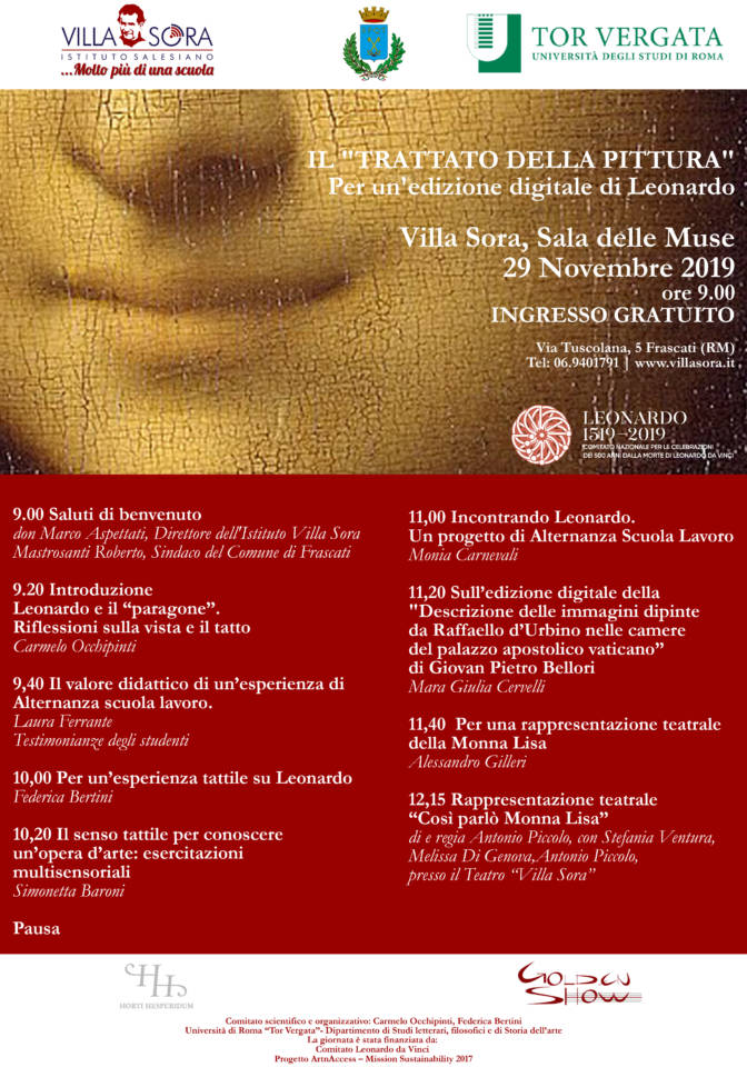 Per celebrare i cinquecento anni dalla morte del celeberrimo genio rinascimentale, Villa Sora offre le sue sale affrescate ad opera della bottega del Cavalier d’Arpino. Tra gli eventi del Comitato Leonardo Da Vinci si annovera infatti anche il convegno che si terrà a Villa Sora il 29 novembre 2019. Una giornata di studi in cui sarà presentata l’editio princeps del Trattato della pittura di Leonardo da Vinci, un’opera composita in cui sono raccolti pensieri e appunti dell’autore. L’edizione digitale del testo è stata realizzata grazie al lavoro degli studenti del liceo classico di Villa Sora che hanno svolto, presso l’Università di Tor Vergata e sotto la guida del prof. Occhipinti, un percorso di alternanza scuola lavoro estremamente qualificante. I ragazzi hanno avuto occasione di confrontarsi con l’ambiente universitario e un impegno all’altezza di esso. Il convegno si aprirà con i saluti del direttore dell’Istituto Salesiano Villa Sora, don Marco Aspettati, e del sindaco di Frascati, Roberto Mastrosanti. Il prof. Carmelo Occhipinti, docente presso l’Università degli studi di Roma “Tor Vergata”, introdurrà il tema della giornata per poi lasciare la parola ai molteplici interventi (Laura Ferrante, Federica Bertini, Simonetta Baroni, Monia Carnevali, Maria Giulia Cervelli e Alessandro Gilleri) che offriranno diversi punti di vista sulla figura di Leonardo Da Vinci Al termine dei lavori andrà in scena, per gli studenti di Villa Sora, lo spettacolo teatrale “Così parlò Monna Lisa”, scritto e diretto da Antonio Piccolo, uno dei ragguardevoli drammaturghi under 35 nello scenario teatrale italiano.