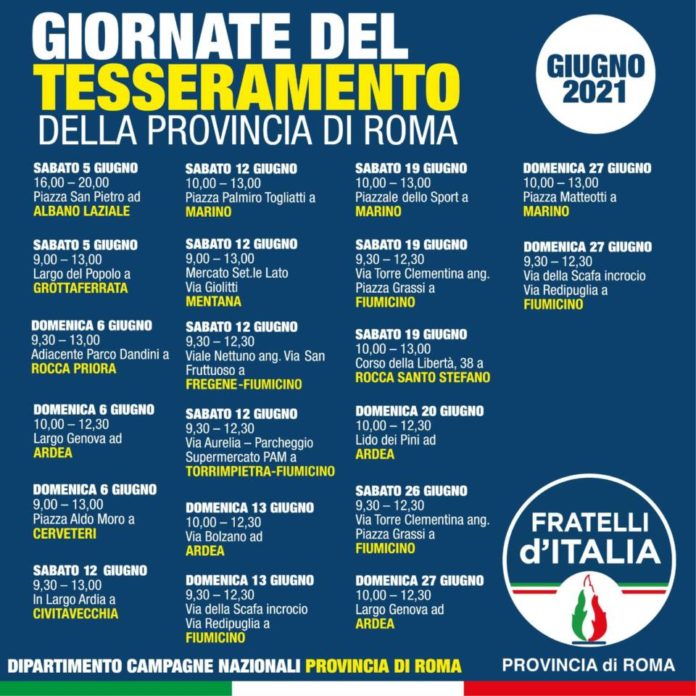 Cercheremo di coprire con i gazebo per il tesseramento tutti i 120 comuni della federazione Provinciale, sempre in sicurezza e senza abbassare la guardia, ma adesso che le restrizioni dovute al Covid finalmente si sono allentate, siamo felici di tornare in strada con i nostri militanti per dare la possibilità a chi vorrà di aderire al partito e alla Comunità di Fratelli d’Italia” lo dichiara in una nota il deputato e presidente provinciale romano di Fratelli d’Italia, Marco Silvestroni.