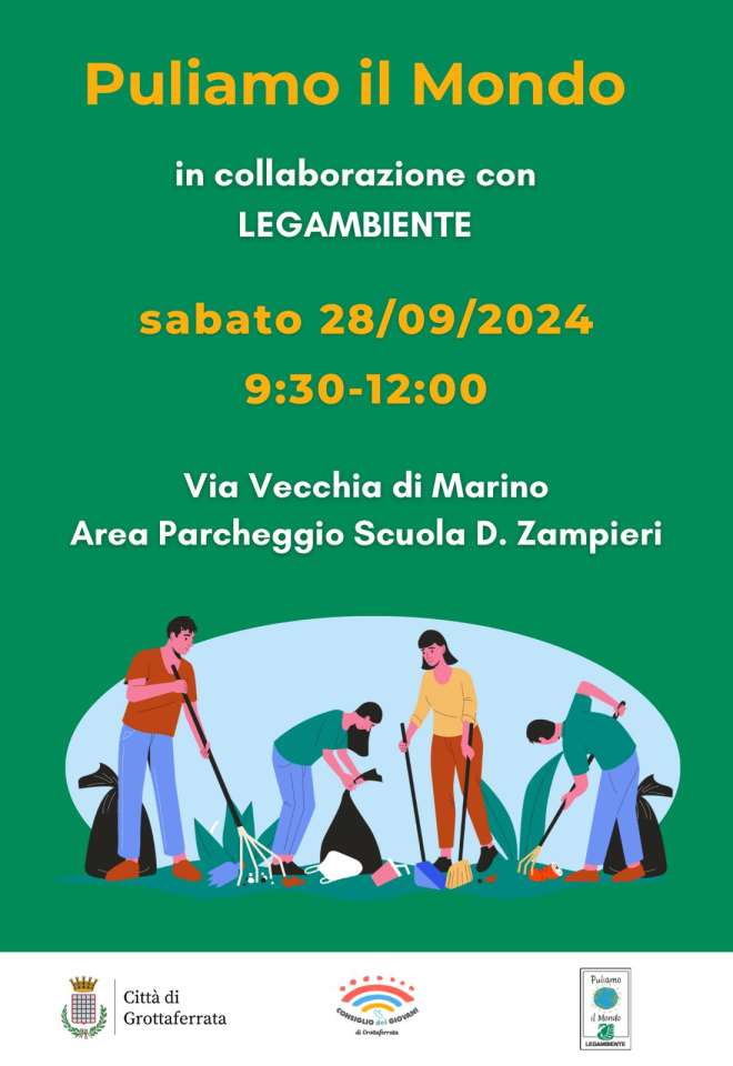Il prossimo sabato 28 settembre si terrà la seconda edizione di “Puliamo il Mondo”, un’iniziativa di pulizia ambientale organizzata dal Consiglio comunale dei Giovani di Grottaferrata in collaborazione con Legambiente. Il ritrovo è previsto presso l’Area Parcheggio della Scuola D. Zampieri, in Via Vecchia di Marino (Grottaferrata) alle ore 9:30.