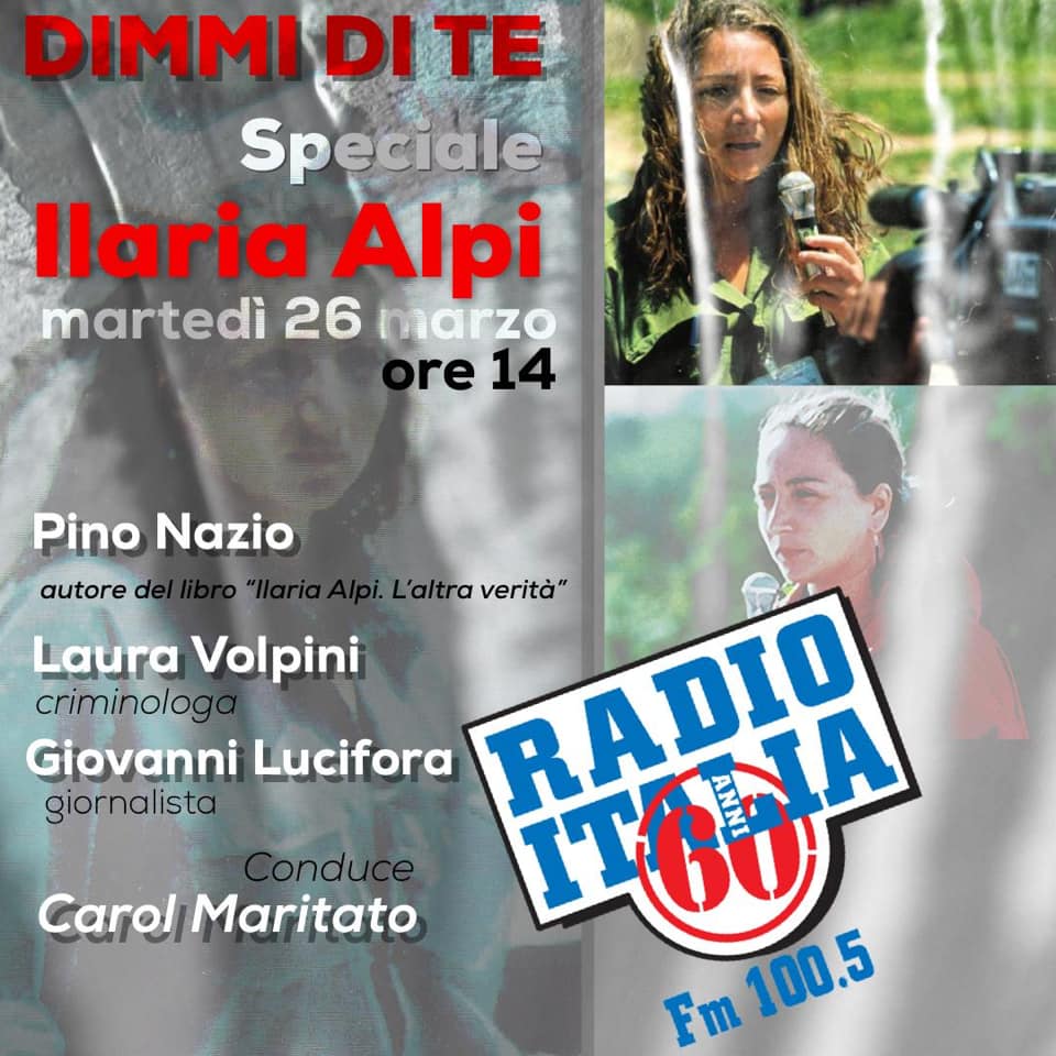 Una puntata speciale, quella di “Dimmi di te” che andrà in onda martedì 26 marzo, dalle ore 14 alle ore 15, su su Radio Italia Anni ’60, in frequenza a Roma sui 100.50 Fm e in diretta streaming sull’App per dispositivi mobili, sul sito www.radioitaliaanni60roma.ite sul sitowww.radiosanremoweb.it. Si parlerà del tragico destino della giornalista e fotoreporter della Rai Ilaria Alpi, assassinata a Mogadiscio il 20 marzo del 1994, insieme al suo cineoperatore: una morte assurda, che ha fatto piangere un intero paese, e dalla quale sono passati 25 anni. Ilaria Alpi era una donna coraggiosa, buona, giovanissima e che ha pagato il suo desiderio di libera informazione con la sua stessa vita.