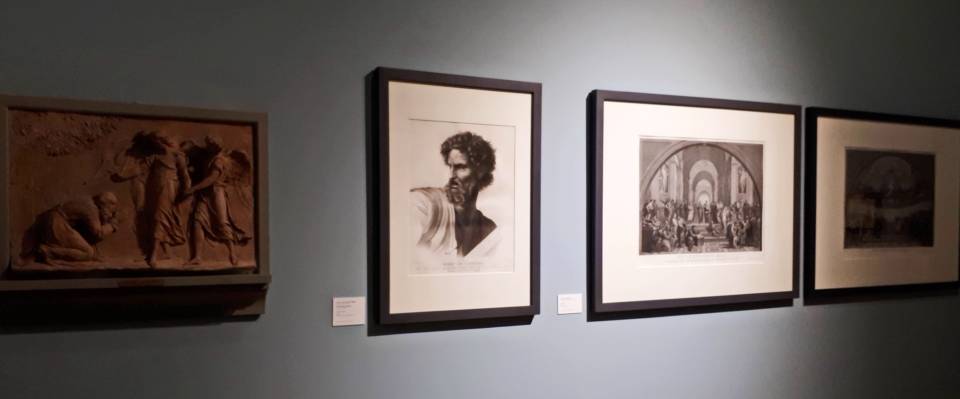 La terza costituisce un focus sul ruolo dell’opera di Raffaello nella cultura e nella didattica: in mostra, i disegni di giovani artisti in occasione dei concorsi accademici e varie copie da opere raffaellesche, in particolare dalle scene delle “Logge Vaticane” e dall’ “Isaia” della chiesa romana di Sant’Agostino. Questi giovani si formavano sulle incisioni di Giovanni Volpato, o sull’album inciso da Giovanni Folo su disegno di Vincenzo Camuccini, dedicato all’ultima opera del grande maestro, la “Trasfigurazione”. Con questi, oggetti che raccontano altre forme di promozione del mito di Raffaello attuate dall’Accademia nel corso degli anni: il culto del “Cranio di Raffaello”, conservato come una reliquia in Accademia fino alla fine del XIX secolo, o le medaglie celebrative. La quarta raccoglie un piccolo nucleo di fotografie attraverso cui sarà possibile restituire la centralità del “San Luca” e del “Putto” negli allestimenti storici della collezione, come centrale, nel percorso espositivo, è la copia della celebre “Galatea” realizzata da Pietro da Cortona nella splendida, omonima sala. L’ultima sezione è una piccola galleria di opere di grandi maestri: dipinti, incisioni e cartoni che raccontano le svariate modalità con cui gli artisti accademici hanno rielaborato, nel tempo, l’esempio del maestro di Urbino; come fu osservato, assimilato e rielaborato.