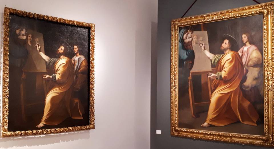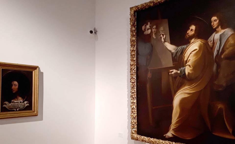 L’allestimento, di Francesco Cellini, articola l’itinerario in 5 sezioni: la prima sezione ruota attorno alla pala raffigurante “San Luca che dipinge la Vergine”, attribuita allo stesso Raffaello e assunta come immagine-simbolo dell’Accademia di Palazzo Carpegna. Qui, per la prima volta, è esposta una fedele copia di Antiveduto Gramatica di inizio Seicento, attualmente sull’altare della chiesa dei Santi Luca e Martina della Capitale. A corredo, traduzioni calcografiche, disegni e incisioni tratti da esse. Nella seconda si ripercorre la storia del “Putto reggifestone” attribuito a Raffaello, giunto in Accademia per lascito testamentario e immediatamente esposto nella galleria per essere copiato da una schiera di pittori dilettanti e professionisti. Tra queste, ora, c’è quella di Gustave Moreau del 1858 (dall’omonimo Musée di Parigi) che crea un inedito pendant con quel “Il Putto” che, attualmente, è al centro di nuove, interessanti, indagini conoscitive da parte di un team multidisciplinare.