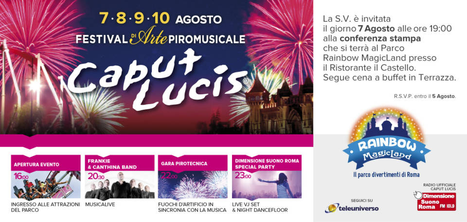 Il programma di Caput Lucis 2015 vede come co-protagonista la musica! A partire dalle ore 20:30 l’atmosfera si scalderà con la musica coinvolgente soulfunky- dance 70/80 di Frankie & Canthina Band, la nota band della Capitale legata agli eventi Caput Lucis. Dalle ore 22:00 la Grande Sfida del Fuoco ed il cielo di Rainbow MagicLand si riempirà di luci e colori a ritmo di musica. Dopo i fuochi d’artificio la serata continuerà con lo Special Party di Dimensione Suono Roma, la Radio Ufficiale di Caput Lucis con il loro fantastico VJ Set, per ballare fino a tarda notte. Tutto compreso in un unico biglietto con apertura straordinaria fino alle 2 di notte!
