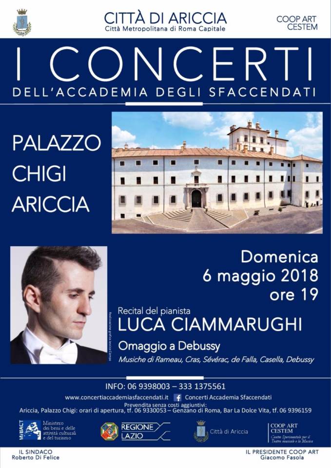 Dopo il grande successo del Concerto di Inaugurazione del Festival dell’Organo di Galloro, i Concerti dell’Accademia degli Sfaccendati tornano a Palazzo Chigi con un recital pianistico di grande interesse e raffinatezza dedicato a Debussy per il suo centenario che si terrà domenica 6 maggio, alle ore 19: ne sarà protagonista Luca Ciammarughi, già ospite degli “Sfaccendati” in veste di musicologo in occasione del concerto con inediti di Wolf-Ferrari per l’inaugurazione della Stagione 2018. Quello che propone Ciammarughi è un percorso di Omaggi a specchio che comincia con Allemande, Gavotte et Doubles di Rameau, alle radici clavicembalistiche del pianismo di Debussy, a cui segue il suo Hommage à Rameau dalla prima serie delle Images per proseguire con un alternarsi di composizioni del festeggiato con altre, di raro ascolto, di autori della sua epoca e del suo ambiente culturale quali Jean Cras e Déodat de Sévérac, per finire con l’ Homenaje “Pour le Tombeau de Debussy” di Manuel de Falla, con un altro omaggio di Casella e con Children’s Corner di Debussy. Un percorso non solo musicale di cui l’interprete non mancherà di illustrare tutti i nessi ricostruendo il mondo di Debussy. Luca Ciammarughi terrà anche la Lezione/Concerto di lunedì 7 maggio con gli Studenti delle Scuole del territorio per il progetto “Incontri col Maestro” che grande interesse ha riscosso tra le scolaresche.
