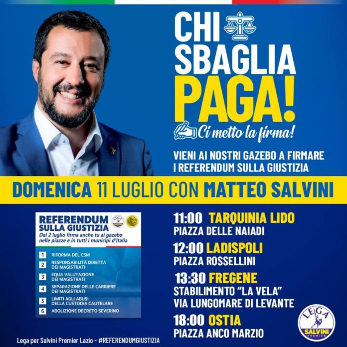 Prosegue la raccolta firme per il referendum sulla giustizia proposto dalla Lega. Domani, domenica 11 luglio, Matteo Salvini parteciperà ai gazebo allestiti lungo il litorale laziale al fine di permettere a tutti i cittadini di sottoscrivere la proposta.