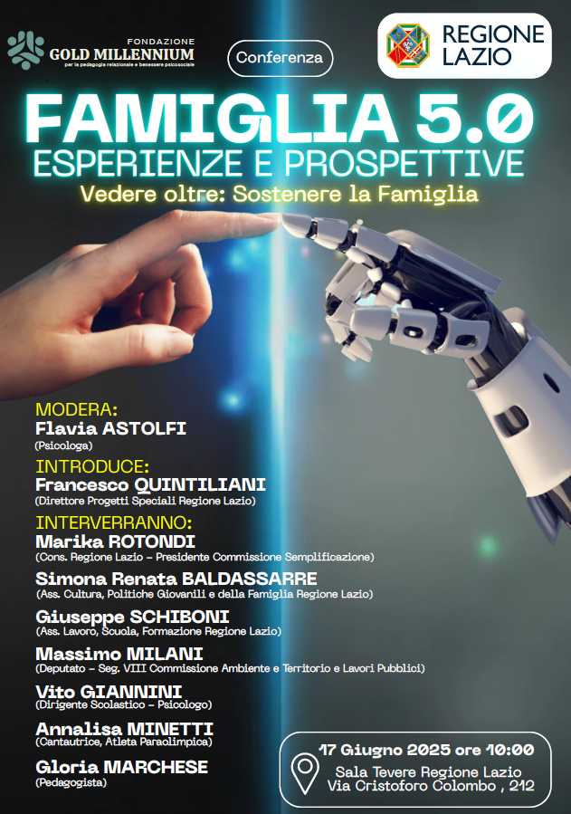 “Si terrà Martedì 17 Giugno, dalle ore 10.00 nella Sala Tevere della Regione Lazio in via Cristoforo Colombo n°212, Il convegno “Famiglia 5.0 Esperienze e Prospettive – Vedere Oltre: Sostenere La Famiglia”. Obiettivo del convegno, promosso dal consigliere Marika Rotondi (Fdi), interrogarsi sulle nuove e insidiose forme di disagio giovanile e ragionare insieme, Istituzioni, Associazioni e famiglie su come disinnescarle, contribuendo positivamente ad una crescita equilibrata e serena dei ragazzi, affrontandone le istanze più sentite. Leggendo la realtà giovanile, alla luce della dimensione Social che pervade il nostro tempo e della consuetudine all’utilizzo intensivo e diffuso di smartphone e computer.