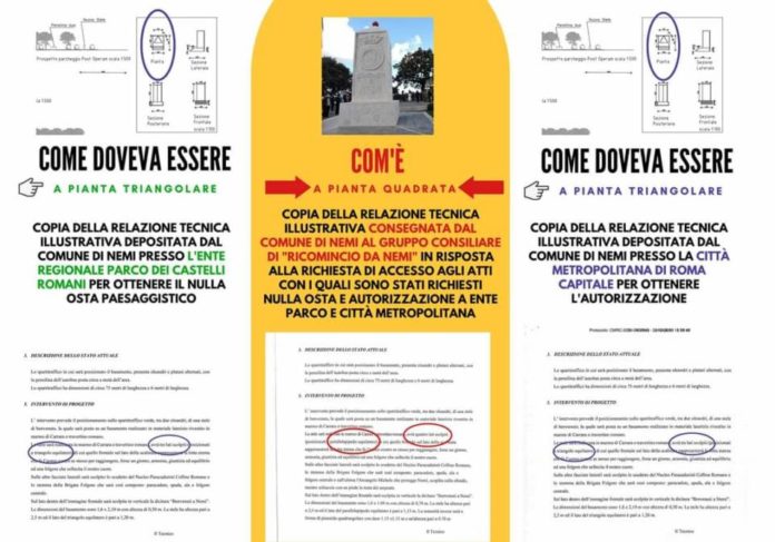 E invece: la relazione tecnica depositata presso gli enti parla di una stele “a tre lati, posizionati a triangolo equilatero”, mentre quella che ci ha fornito il Comune di Nemi parla di “quattro lati scolpiti, posizionati a parallelepipedo equilatero”.