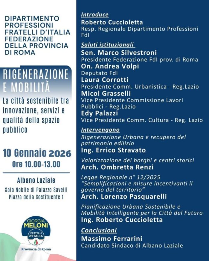 “Sabato 10 gennaio 2026, presso la Sala Nobile di Palazzo Savelli ad Albano Laziale, si terrà l’incontro pubblico “Rigenerazione e Mobilità – La città sostenibile tra innovazione, servizi e qualità dello spazio pubblico”, promosso dal Dipartimento Professioni di Fratelli d’Italia – Federazione della Provincia di Roma.
