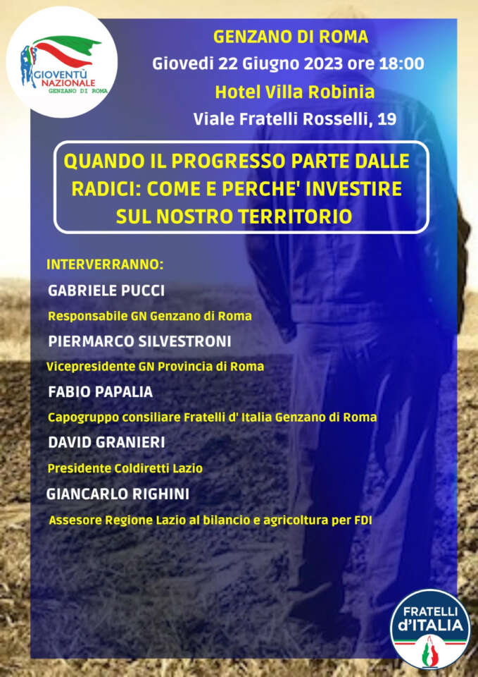“Quando il Progresso Parte dalle Radici: come e perché investire sul nostro territorio. E’ il titolo di un convegno sui temi delle politiche agricole, la sovranità alimentare, la tutela e la valorizzazione del territorio, promosso da Gioventù Nazionale di Genzano, fissato per Giovedì 22 Giugno alle ore 18:00, presso l’Hotel Villa Robinia, sito in Via Fratelli Rosselli 19 a Genzano di Roma.