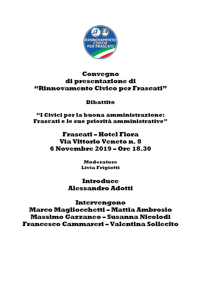 Mercoledì 6 Novembre alle ore 18.30, presso l’hotel “Flora” di Frascati, si terrà il convegno “I Civici per la buona amministrazione: Frascati e le sue priorità amministrative”: i lavori saranno introdotti da Alessandro Adotti, con gli interventi di Marco Magliocchetti, Mattia Ambrosio, Massimo Gazzaneo, Susanna Nicolodi, Francesco Cammareri e Valentina Sollecito, moderatrice Livia Frigiotti. Il Portavoce di Rinnovamento Civico per Frascati, Massimo Gazzaneo, ha dichiarato quanto segue:“Crediamo che il motore della presente e di future esperienze politico – amministrative a Frascati dovrà essere rappresentato anche da realtà civiche, aperte ed inclusive, che facciano della buona amministrazione cittadina la priorità essenziale, superando sterili schemi del passato e ripetizioni di film già visti troppe volte. Quello che conta davvero, al livello comunale, sono le soluzionirelative alla crescita della realtà frascatana ed al benessere dei Cittadini. Noi di Rinnovamento Civico per Frascati vogliamo impegnarci, senza personalismi e senza la logica degli apparati, quali donne e uomini liberi – consapevoli dei nostri valori e riferimenti – al servizio della politica che ritorna a misurarsi con i bisogni e le emergenze di un tempo di profondi cambiamenti, per contribuire a costruire il confronto e l’ elaborazione di soluzioni amministrative adeguate ai bisogni di Frascati, dal suo centro ai suoi quartieri periferici.”