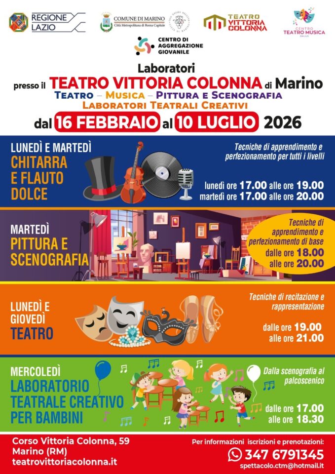 Dopo la pausa per le Festività natalizie a partire dal 15 febbraio 2026 riprenderanno le attività dei Laboratori gratuiti, fortemente voluti dal Direttore artistico del Teatro “Vittoria Colonna” di Marino Giorgio Granito e dal Centro di aggregazione giovanile costituitosi lo scorso anno presso il Comune di Marino.