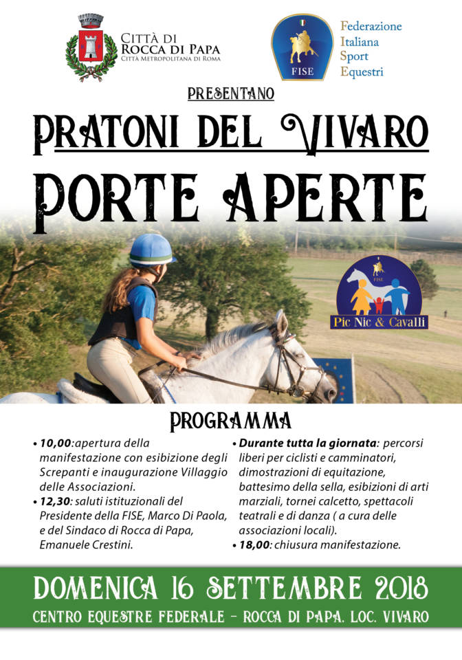 Domenica 16 settembre 2018 daremo l’avvio a una fase per questo luogo simbolico. Si terrà, infatti, la manifestazione “Pratoni del Vivaro – Porte Aperte”, organizzata dal Comune di Rocca di Papa e dalla FISE, nella quale la Federazione e le associazioni locali avranno modo di presentarsi, ognuna dando vita a differenti iniziative aperte al pubblico, come dimostrazioni equestri, battesimi della sella, percorsi per ciclisti e camminatori, esibizioni di arti marziali, spettacoli musicali, teatrali e di danza.
