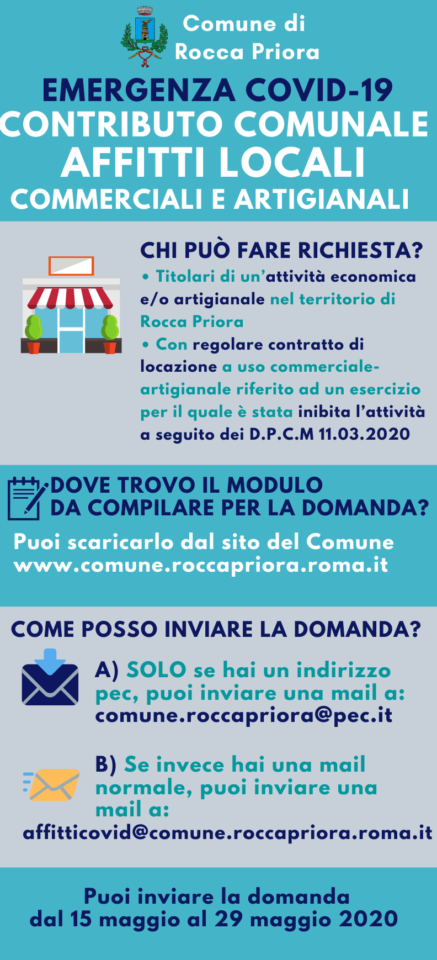 Il Comune di Rocca Priora, considerata l’emergenza sanitaria e la connessa crisi economica che si è venuta a creare a seguito della sospensione di molte attività artigianali e commerciali, ha pubblicato un avviso pubblico per concedere un contributo comunale per i canoni di affitto dei locali. La chiusura delle attività commerciali ha prodotto ingenti danni sia al mondo del lavoro, quindi ai nuclei familiari, e sia alle attività economiche. Danni che sono in misura ancora maggiore per quelle attività che vengono svolte in immobili in affitto e i cui proprietari in questo periodo hanno dovuto pagare il canone di locazione, pur avendo le serrande abbassate del proprio negozio. Ecco perché il Comune ha voluto destinare e riservare dei contributi a chi tiene in vita il nostro tessuto economico: a tutti quei commercianti e artigiani di Rocca Priora che hanno bisogno di una mano per ripartire in sicurezza e in tranquillità. La misura straordinaria è stato pensato proprio a tutela degli esercizi commerciali ed artigianali roccaprioresi ai quali andrà un contributo non superiore al 40% del canone di locazione previsto, per i mesi di marzo e aprile, proporzionale al valore del canone dell’immobile ed entro il limite di risorse massimo stanziato per la misura pari ad euro 10.000. Le domande dei richiedenti possono essere presentate al Comune a partire dalla dal 15 maggio al 29 maggio 2020.