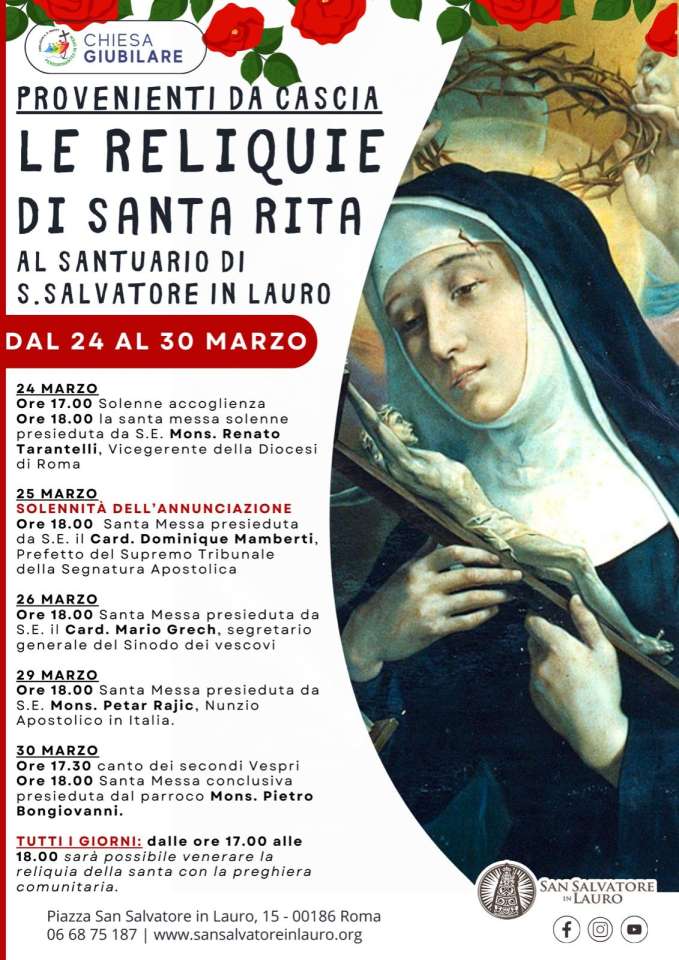 Le reliquie della santa arriveranno da Cascia nel pomeriggio di lunedì 24 marzo, e verranno accolte dalle ore 17.00 in santuario. Alle 18.00 verrà celebrata la santa messa solenne da S.E. Mons. Renato Tarantelli, Vicegerente della Diocesi di Roma. La celebrazione, a cui parteciperanno i gruppi di preghiera e che sarà animata dai cantori della Cappella Musicale Lauretana, apre così l’intensa settimana di presenza delle reliquie della santa. San Salvatore in Lauro è stato scelto dal Dicastero per l’Evangelizzazione come Chiesa Giubilare con lo speciale compito di accogliere i pellegrini venuti da tutto il mondo per l’anno santo. Durante il periodo del Giubileo, quindi, verranno proposte nuove ulteriori iniziative spirituali a beneficio dei fedeli.