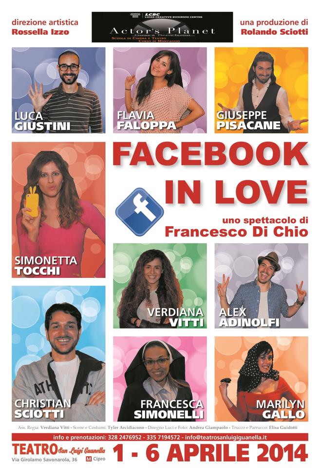 Al teatro San Luigi Guanella di via Girolamo Savonarola, 36 di Roma dal primo al 5 aprile alle ore 21 e il domenica 6 aprile alle ore 17 in scena Facebook in love. Lo spettacolo ha la direzione artistica di Rossella Izzo e la regia di Francesco De Chio, che tornano a lavorare insieme le compagnie teatrali  “Follia Officina D’Arte” e “Actors Planet”.