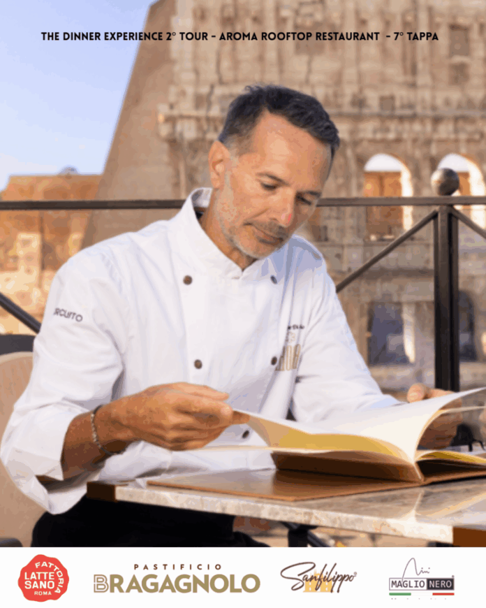 La settima e ultima tappa del format ideato da Cristiano Bucciero – autore del progetto Chefs in Rome – si terrà martedì 28 ottobre alle ore 13:00 presso l’esclusiva terrazza dell’Aroma Restaurant, all’interno del prestigioso Palazzo Manfredi, affacciata direttamente sul monumento simbolo della Capitale.
