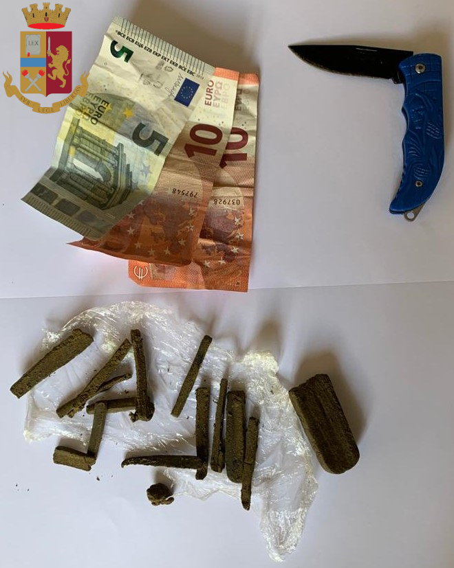 Perquisita, C.P., è stata trovata in possesso di denaro contante,  alcune dosi di hashish e di un coltellino a serramanico intriso della stessa sostanza stupefacente che è stata poi sequestrata.