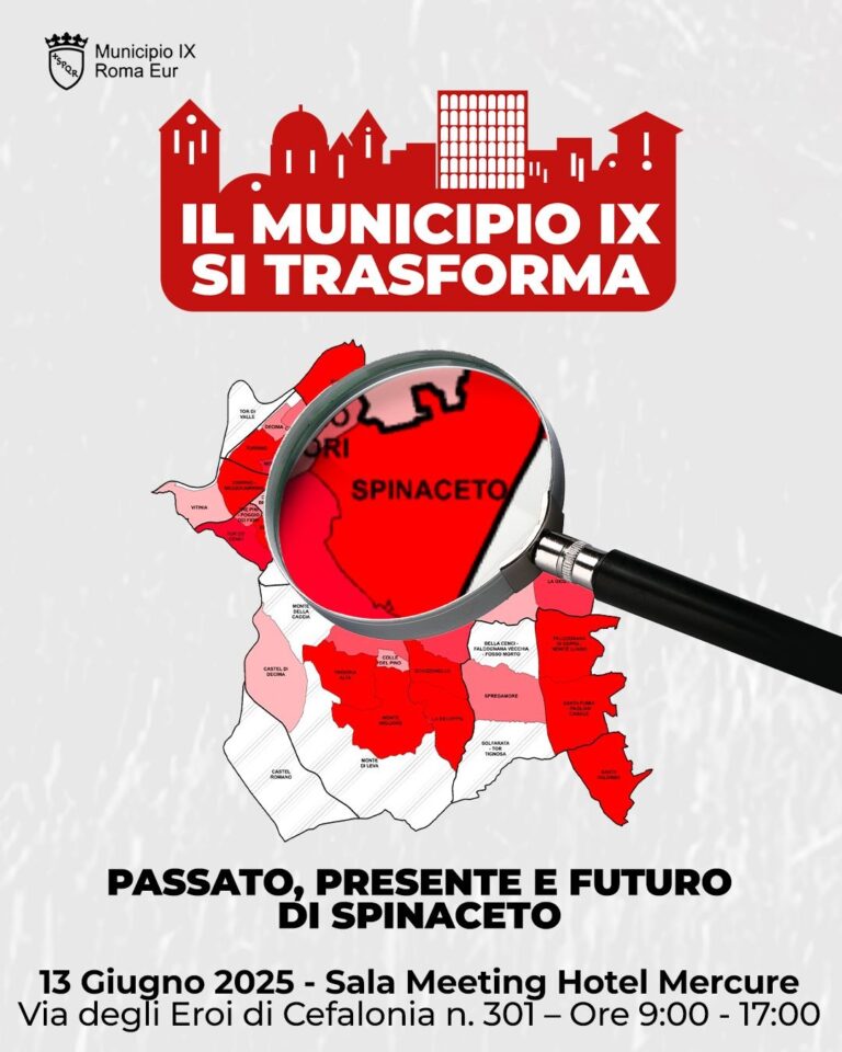 Venerdì 13 giugno il percorso “Il Municipio IX si trasforma – #9incammino” farà tappa a Spinaceto: dalle 9 alle 17 la Sala Meeting dell’Hotel Mercure, in via degli Eroi di Cefalonia 301, ospiterà una giornata di confronto tra istituzioni, università, associazioni e cittadini per fare il punto sugli interventi pubblici realizzati e in corso e per individuare insieme le prossime azioni di rigenerazione urbana, culturale e sociale.
