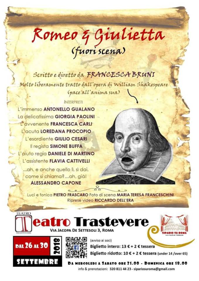 Dopo il successo della commedia “Amleto in salsa piccante”, dell’adattamento de “Il Maestro e Margherita” di Bulgakov, e del profondo ed intimo “Non è poi la fine del mondo”, l’Associazione Culturale “Sipario su Roma” torna a calcare le tavole del palcoscenico con l’esilarante “Romeo & Giulietta (fuori scena)”, commedia scritta e diretta da Francesca Bruni, dal 26 al 30 settembre, al Teatro Trastevere. Impossibile annoiarsi difronte a gag spassose, ritmo vorticoso e dialoghi frizzanti, un mix reso vincente grazie alla regia spigliata ed alla bravura degli interpreti, una compagnia di attori collaudata e talentuosa.