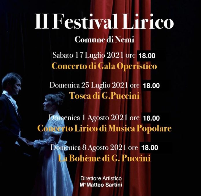 Anche quest’anno Nemi all’Amministrazione guidata dal Sindaco Alberto Bertucci presenta il “Festival Lirico Comune di Nemi” giunto alla sua seconda edizione. Quattro appuntamenti, a cavallo tra Luglio ed Agosto, con la Direzione Artistica del M° Matteo Sartini in collaborazione con PRIMADOPERA, organizzazione che da anni svolge attività di produzione musicale sul territorio dei Castelli Romani.