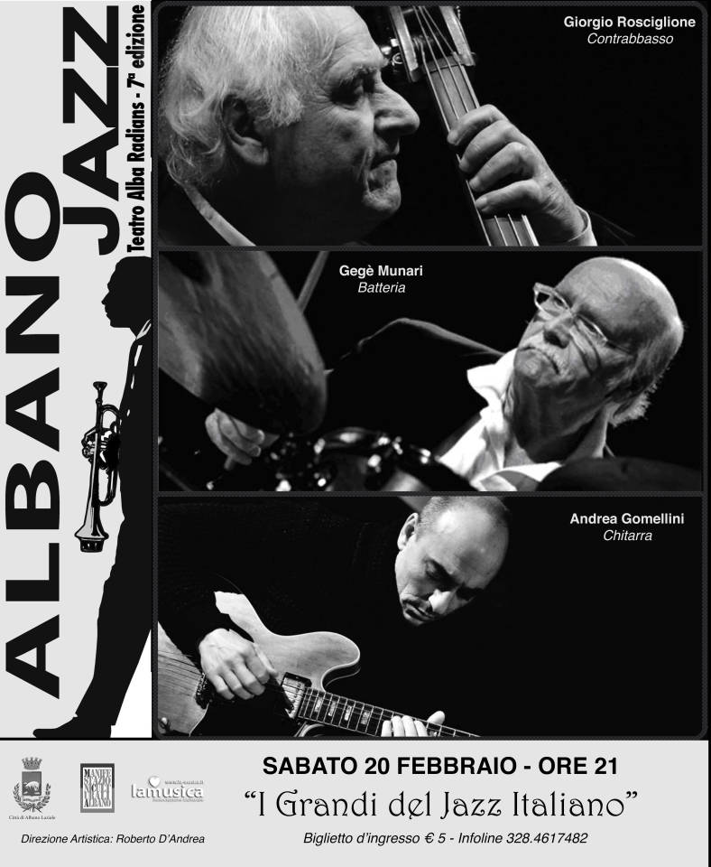 D’Andrea ha poi proseguito: «Giorgio Rosciglione, Gegè Munari e Andrea Gomellini hanno collaborato con i più grandi musicisti raggiungendo ogni angolo dell’Europa. Si esibiranno all’insegna di un jazz melodico e di facile comprensione, anche per i non addetti ai lavori. Su questo concetto si installa tutto l’impianto della settima edizione dell’ “Albano Jazz”».
