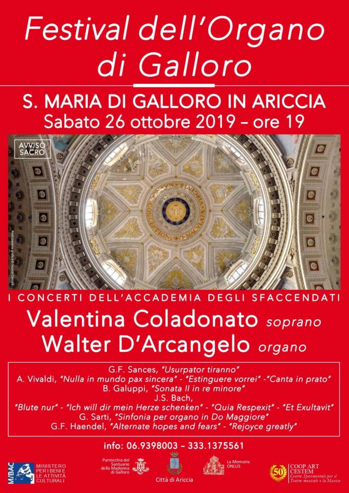 Sabato 26 ottobre, alle ore 19, secondo appuntamento del 2019 del segmento della programmazione dei Concerti dell’Accademia degli Sfaccendati intitolato “Festival dell’Organo di Galloro”. Una piccola Rassegna nella Rassegna ideata per valorizzare il prezioso organo Agati-Tronci presente nel Santuario Mariano ariccino. Protagonisti del secondo appuntamento saranno il soprano Valentina Coladonato e l’organista Walter D’Arcangelo. Concertisti di vaglia internazionale si sono esibiti nei più prestigiosi teatri, dalla Scala di Milano al Musikverein di Vienna all’Opéra National de Paris, solo per citarne alcuni, per Valentina Coladonato, e nelle più insigni cattedrali, dalla Basilica di San Pietro a Roma alla Cattedrale di Monreale alle Cattedrali protestante e cattolica di Mosca, per Walter D’Arcangelo. Eseguiranno un programma dedicato a musiche tra Barocco e Classicismo ricco di capolavori di grande bellezza. Il Concerto è a ingresso libero. “I Concerti dell’Accademia degli Sfaccendati” sono realizzati dalla COOP ART con il patrocinio e il contributo del Comune di Ariccia e del Ministero per i Beni e le Attività Culturali (MiBAC).